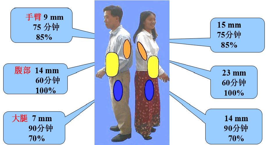 这分别是男性和女性身体不同部位皮下组织的厚度、胰岛素平均吸收时间和吸收率。从这张图上我们可以看到在通常情况下,女性的皮下组织厚度要大于男性。人体腹部的皮下层较厚,胰岛素的吸收率达100%,而且吸收速度最快,其次是手臂。胰岛素吸收速度最慢的是大腿和臀部。