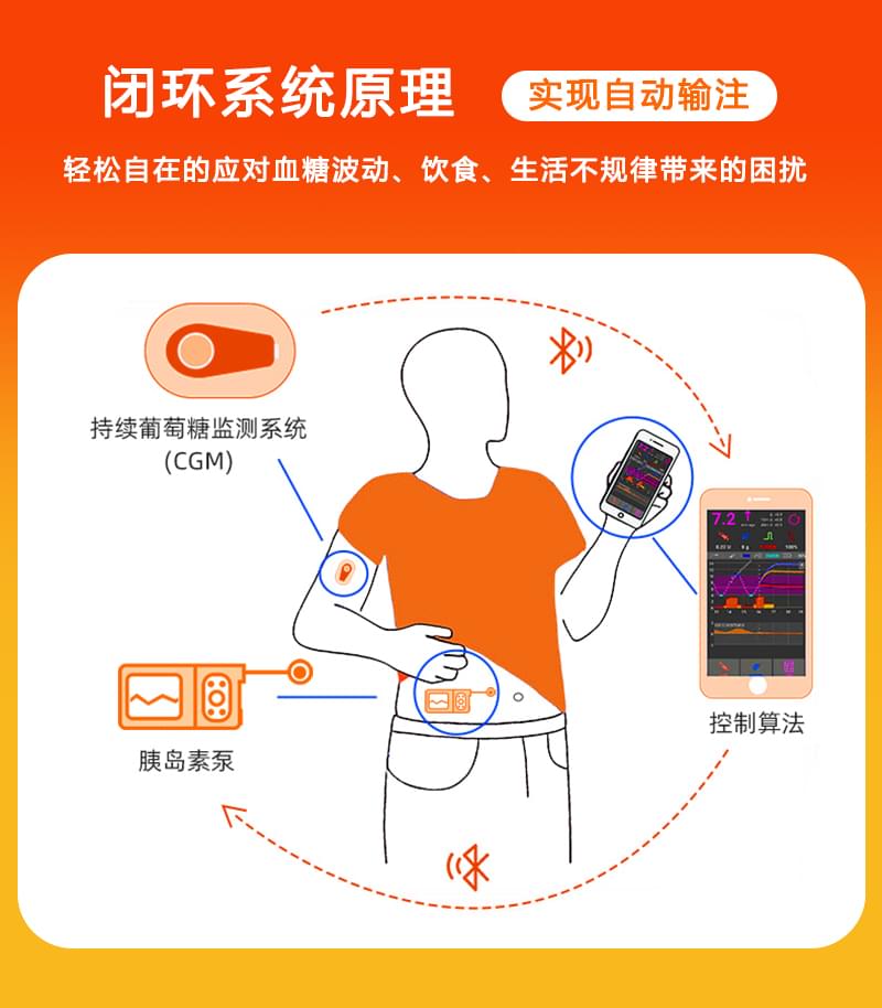 闭环胰岛素泵系统可以自动监测血糖,而后台软件又可以根据实时血糖数值发送给输注系统自动调整胰岛素的注射量...